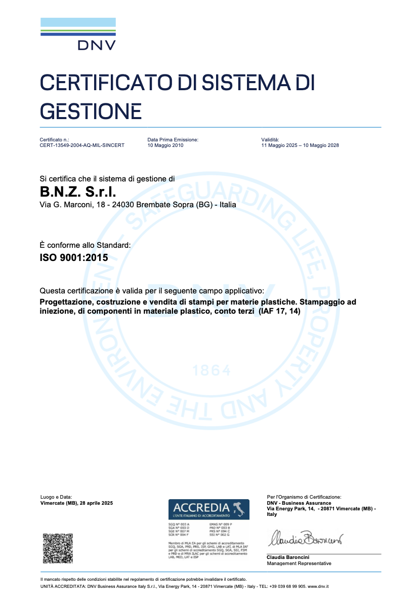 BNZ è certificata UNI EN ISO 9001:2015 e successivi aggiornamenti con l’ente certificatore DNV.